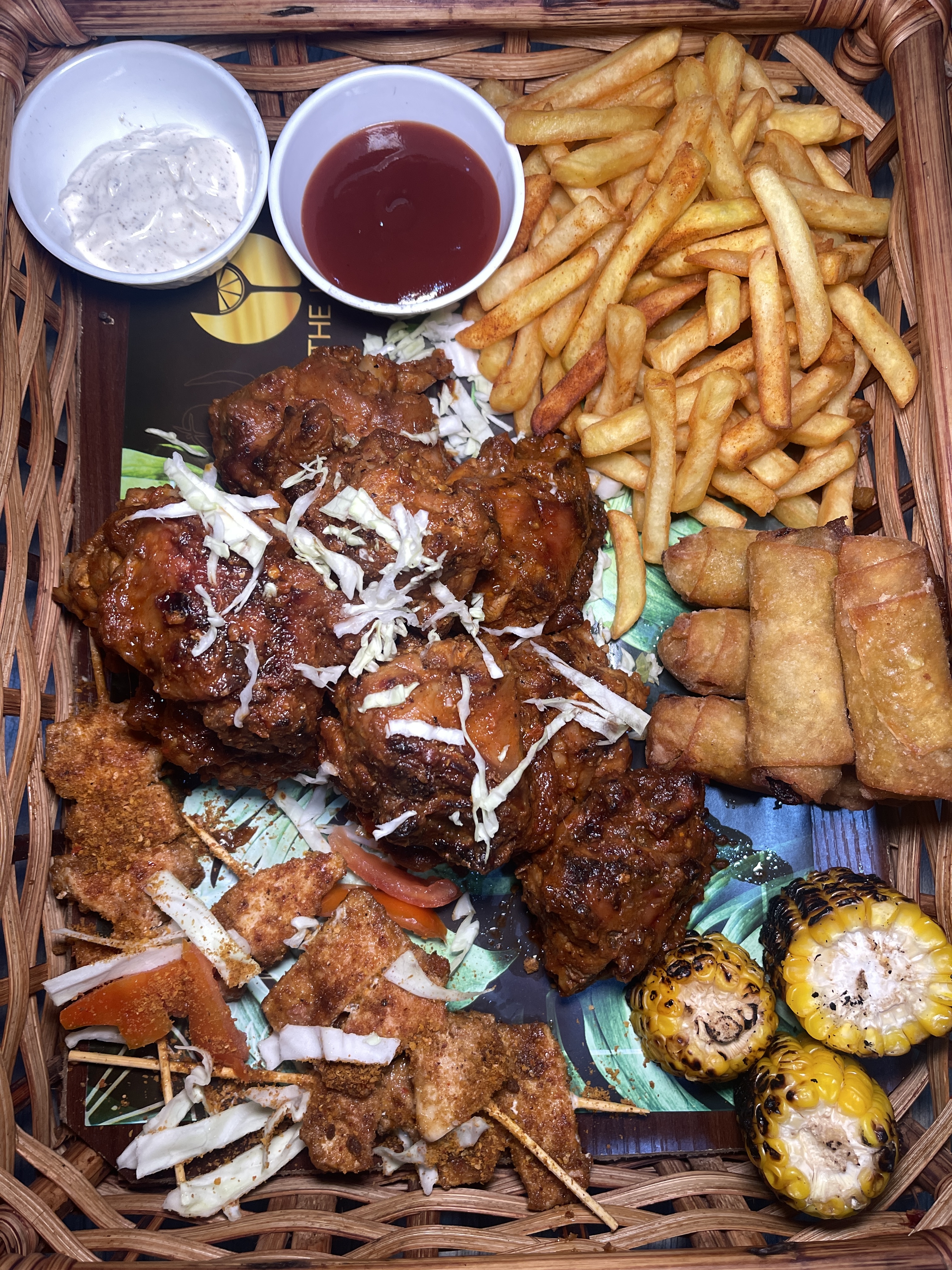 8 Chicken Wings, 8 Spring Rolls, 4 Samosa, 4 Mini Burgers, Sweet Corn French Fries